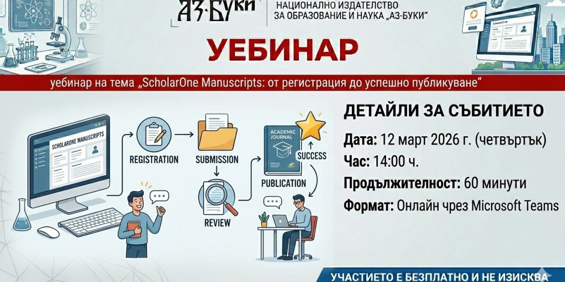 Национално издателство за образование и наука „Аз-буки“ организира специализиран уебинар на тема „ScholarOne Manuscripts: от регистрация до успешно публикуване“, насочен...