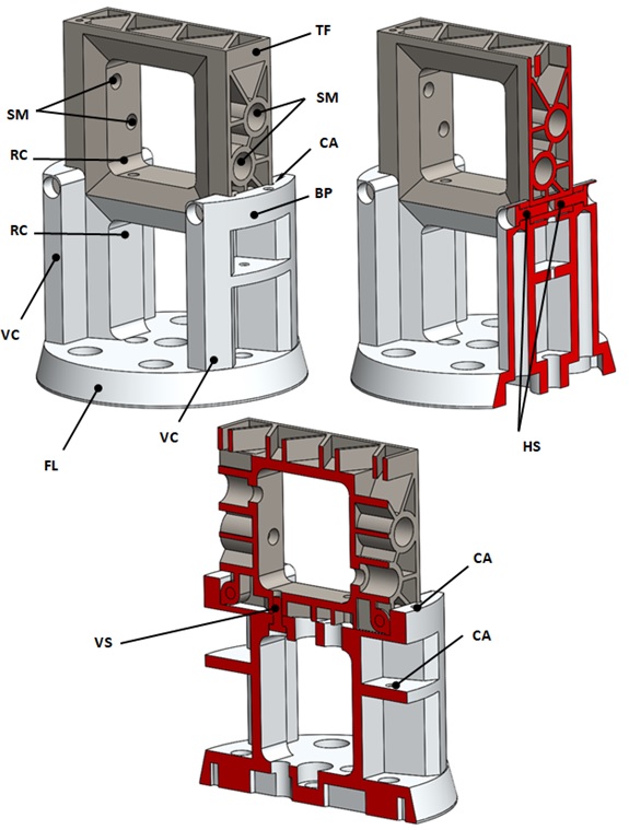All components are decreased by mass and are planned to be produced by milling. The connection between both components is by screws, as it is shown on Figure 4.1. Four screws (HS) are mounted in plane, connecting side columns, and two additional screws (VS) – in vertical direction. Top frame is slotted in special cavities (CA) on both sides of bottom part – to increase contact stiffness.