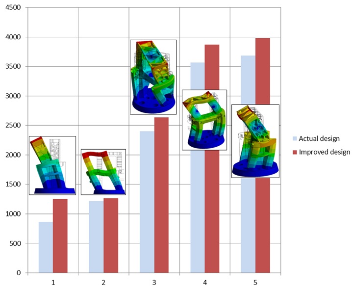 First five natural mode shapes and frequencies are calculated through modal analysis simulation. Obtained results are shown on Figure 8 graphically and it shows the comparison of the initial versus improved design of the fixture.