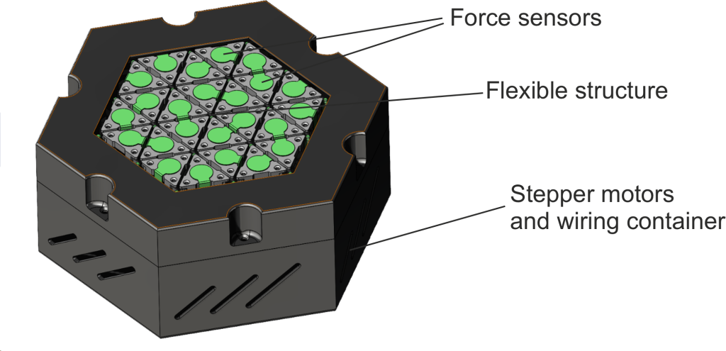 With rotation of the stepper motors the flexures are moved in different vertical positions and depend on the displacement the triangles are moved in different angle. All triangles togethers (the smallest segment) are part of a neural network that can change its surface shape depending on the provided input (in this case the multiple force sensors).