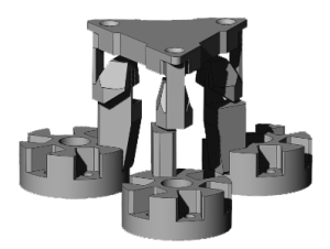 The network consists 24 tripods (Fig. 3) that are able to perform movement along 3 axis (3-DOF). The equivalent simplified parallel kinematic scheme (Fig.2) is 3-PRR mechanism (P – prismatic R – revolute), although relatively long leaf springs have more complex behavior in terms of rotation from one fixed or movable rotation point to two points of rotation depend on the form, stress and deformations.