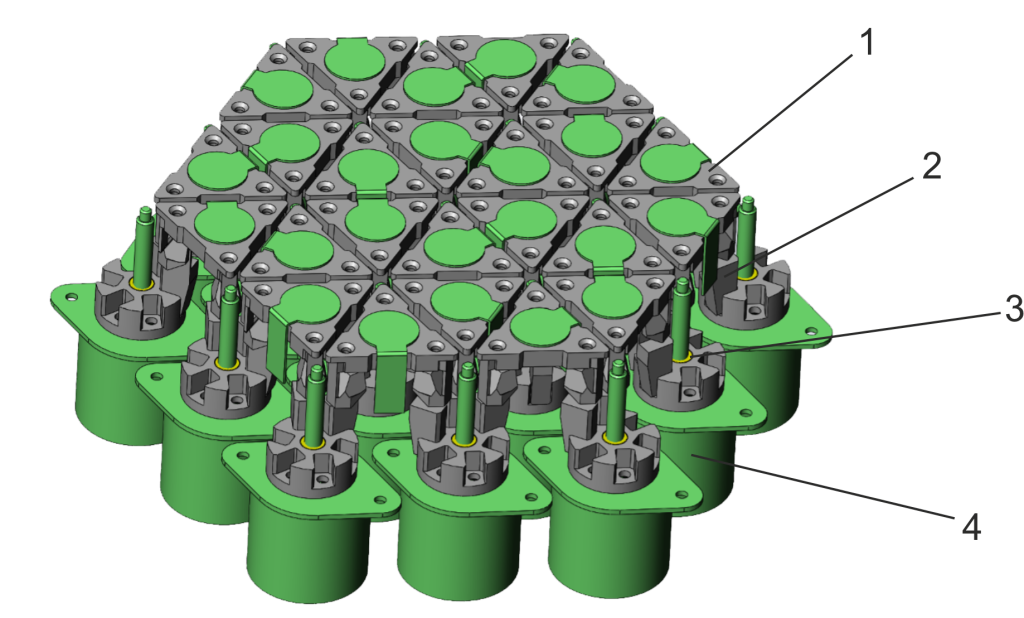 Assembly of the flexure-based structure contains: Platforms in the form of triangles (pos. 1) that can be positioned in a different angle; Flexures (pos. 2); Nuts with threads that are moved via screws (pos. 3) mounted on stepper motors (pos. 4).