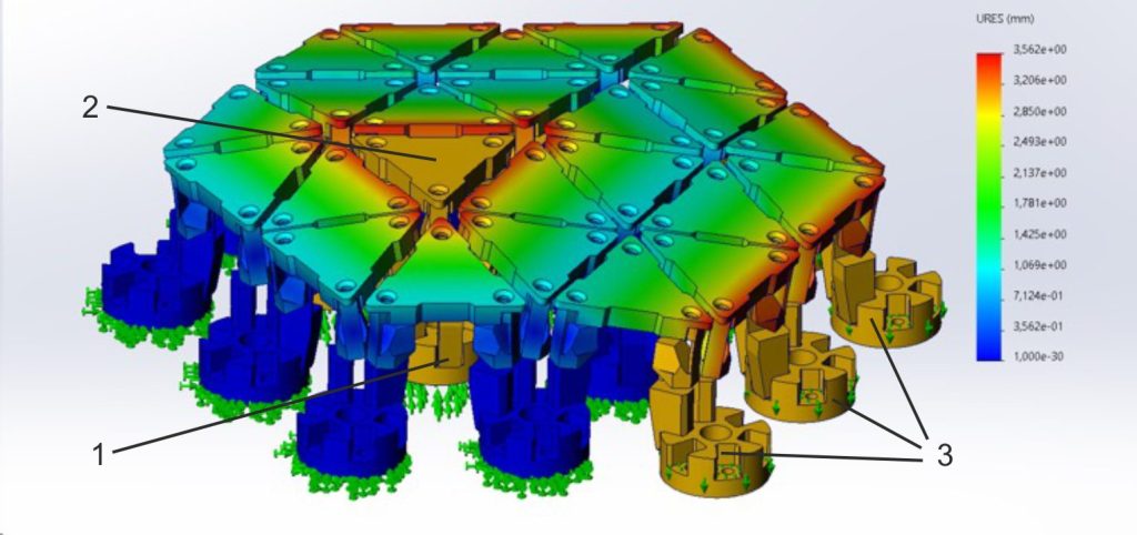In the first study case (fig. 5) the desired shape is convex. One of the triangles has light pressure force on it and needs to move upwards, of course there will be similar deformation if the triangle stays in position and all other triangles are moved down (all motors are activated and all legs of the tripods are moved down according to the desired shape). In this particular study case, the three legs of the tripod that is pressed are activated and moved up with 3 mm (pos. 1), the “middle ring” of tripods (pos. 2) are fixed and all outer legs of the tripods are moved down with 3 mm (pos. 3).