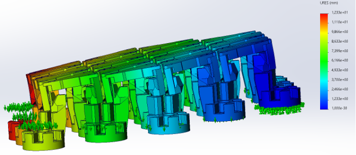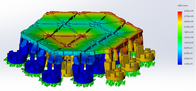 In this study case where a concave shape is required, the design is more restricted due to the distance between the triangles. The developed flexures can provide more than 5.5 mm movement of the legs along Z axis but the triangles are pressed each other before reaching this distance. The results show that the maximum displacement along Z axis in case the needed shape is concave is 2.7 mm when the distance between two triangles is 1.2 mm. In case more displacement is needed, the distance between triangles need to be enlarged.