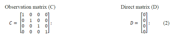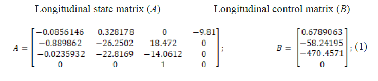 The state matrices are complemented with the observation and direct dependency matrices (2) to obtain the full state space in the longitudinal channel of the UAV.