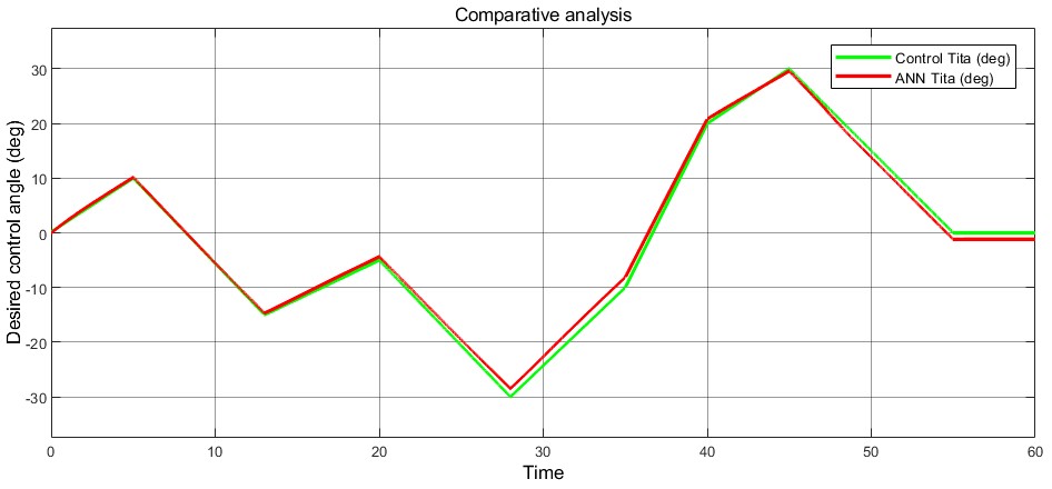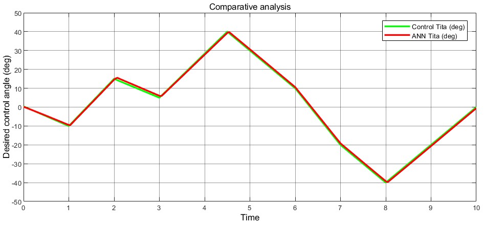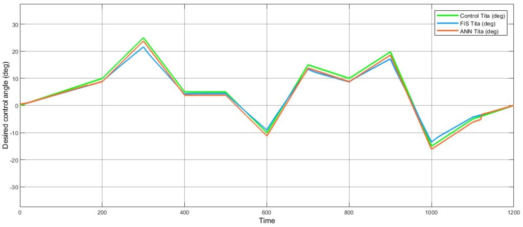 Test simulations were performed to verify and analyze the performance of the trained artificial neural network compared to a desired input signal, and to validate the results with that of the controller with FIS. Fig. 10 shows the results of a simulation in the Simulink environment when setting a desired pitch angle Θ. It can be seen that the control signal is relatively equal to the set desired angle for controlling the longitudinal movement of the unmanned aerial vehicle, and the absolute error