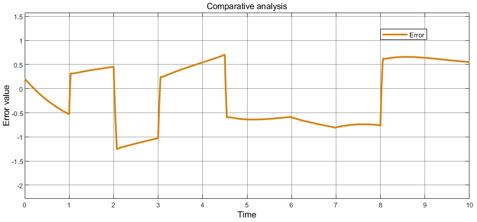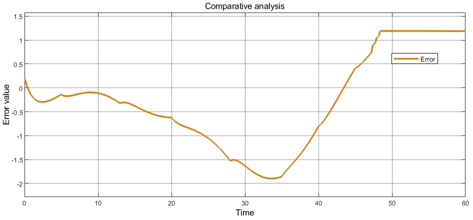 Fig. 12 shows the results of a simulation with a signal other than the trainer for a period of 60 seconds. Fig. 13 shows the absolute error when validating the operation of the ANN during longer operation. To validate the results, a comparative analysis was made between the trained neural network and a fuzzy controller, which was used for training the ANN. The simulation results are shown in Fig. 14.