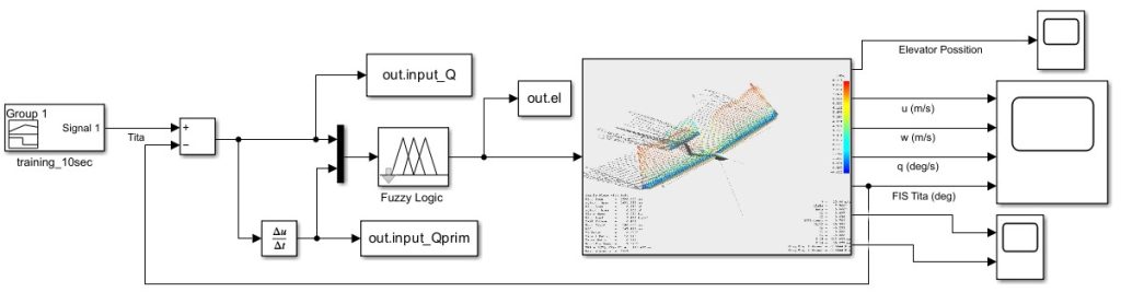 The main results of this study are shown in (Calovska et al., 2024). These results are used to build array vectors of input and output data for ANN training. It was decided to use data from the Fuzzy Interference System (FIS) Controller for ANN training. The data are structured into the arrays through simulations in the MATLAB-Simulink environment. Fig. 3 shows the modeled mechatronic system, which data from the control of the longitudinal motion of the UAV were obtained.