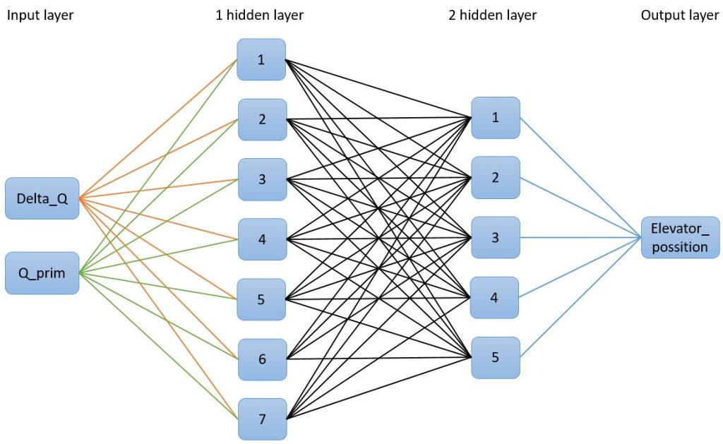 For the implementation of the specific task, the input neurons are chosen to be two, respectively input for the data sets for the control error (delta Q) and input for the direction of this error (Q prim). The hidden layers are chosen experimentally to be two, based on the training/time ratio. The first hidden layer has seven neurons, and the second hidden layer has five neurons.