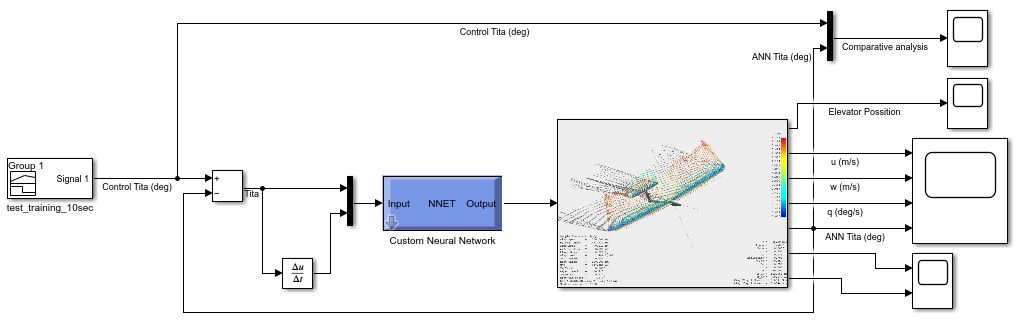 Fig. 8 shows the structural scheme used to evaluate the effectiveness of the ANN in controlling the longitudinal motion of the UAV. The analysis uses the function “genism”, which is built into the MATLAB, and allows the ANN to be visualized and integrated as a standalone functional block within the Simulink environment. The structural layout of the resulting ANN block diagram is illustrated in Figure 9.