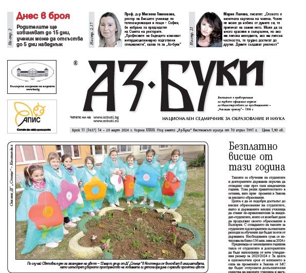 <h4><img class="size-medium wp-image-120941 alignleft" src="https://azbuki.bg/wp-content/uploads/2024/03/azbuki-11-2024--211x300.jpg" alt="" width="211" height="300" />Темите в новия броя:</h4> - Проф. д-р Миглена Темелкова, ректор на Висшето училище по телекомуникации и пощи – София, бе избрана за председател на Съвета на ректорите: „Професиите на бъдещето изискват интердисциплинарно подготвени специалисти“, казва тя в интервю за „Аз-буки“ - Приеха минимум за академичните заплати - Най-ниското възнаграждение за асистентите да нарасне до 2100 лв. от 1 януари 2024 г., предвижда проект за постановление на Министерския съвет - Безплатно висше от тази година - Родителите ще извиняват до 15 дни - Ученик ще може да отсъства по семейни причини до 5 дни наведнъж - Изграждат 33 нови училищни сгради и детски градини - Без телефони в часовете - Тази практика подобрява концентрацията на учениците, категорични са от ОУ „Св. св. Кирил и Методий“ в столичния кв. „Бенковски“ - „Бърза помощ“ спасява ДНК - Наши учени от Института по микробиология изследват т.нар. двойноверижни скъсвания – най-токсичните увреждания в молекулата на наследствеността - Мария Лалева, писател: „Словото е визитната картичка на човека. Човек не може да избяга от думите си, те приличат на самия него. Може да са много красиви и съвършени, но ако им липсва мелодията, ако им липсва честността, те трудно достигат до другия. Думите създават реалност“ <a class="fp-embed" style="max-width: 100%;" href="https://73fc06f9.flowpaper.com/112024/" data-fp-width="400px" data-fp-height="300px">Вестник "Аз-буки" брой 11/2024</a><script async defer src="https://cdn-online.flowpaper.com/zine/3.8.3/js/embed.min.js"></script> <a href="https://azbuki.bg/wp-content/uploads/2024/newspaper/%D0%B2.%20%D0%90%D0%B7-%D0%B1%D1%83%D0%BA%D0%B8%2C%20%D0%B1%D1%80.11%2C%202024%20%D0%B3..pdf" target="_blank" rel="noopener">Изтеглете</a> броя на вашeто устройство.