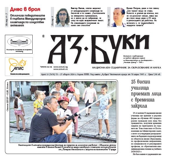<h4><img class="size-medium wp-image-131977 alignleft" src="https://azbuki.bg/wp-content/uploads/2024/08/azbuki-33-2024-212x300.jpg" alt="" width="212" height="300" />Четете в новия брой:</h4> - Ремонтират 150 школа преди първия звънец: В 45 от тях строителните дейности няма да приключат до 15 септември - 25 висши училища приемат лица с временна закрила - 1800 лева за студент в дуално обучение - Изучават и турски език като чужд: Предметът се въвежда в гимназиален етап от новата учебна година - България с два бронзови медала от Международната олимпиада по изкуствен интелект - Първият ни отбор грабна и златно отличие в практическата част на състезанието, което се провежда за първи път у нас - Няма нерешими задачи: В това е уверен Виктор Лилов, спечелил златни медали от две различни олимпиади - Забавно лято в село Елешница: Децата в Народно читалище „Елин Пелин 1929“ изработват от сапун ароматни цветя и мечета - С линия на времето миналото оживява: СУ „Христо Ботев“ в Русе модернизира кабинета си по история и цивилизации с интерактивни карти - <strong>Признание -</strong> Опитвам се да не бъда учител в рамка: Не само изкуственият, но и естественият интелект трябва да е на ниво, казва Янка Минева от СУ „Васил Левски“ – Карлово - Рискове пред климата: Доброволци гарантират обективността на докладите на експертите, казва проф. Георги Гаджев - <strong>Учителите на моя живот -</strong> Васил Петров, джаз и поп певец: Талантът е водещ в музиката, но без трудолюбие не става - Рисунките на Вяра правят света по-добър: С пътуване до Индия започва историята на 14-годишната художничка от ПМГ „Акад. Иван Гюзелев“ в Габрово, която вече има над 500 награди <a class="fp-embed" style="max-width: 100%;" href="https://73fc06f9.flowpaper.com/332024/" data-fp-width="400px" data-fp-height="300px">Вестник „Аз-буки” 33/2024</a><script async defer src="https://cdn-online.flowpaper.com/zine/3.8.3/js/embed.min.js"></script> <a href="https://azbuki.bg/wp-content/uploads/2024/newspaper/%D0%B2.%20%D0%90%D0%B7-%D0%B1%D1%83%D0%BA%D0%B8%2C%20%D0%B1%D1%80.%2033%2C%202024.pdf" target="_blank" rel="noopener">Изтеглете </a>броя на вашeто устройство.