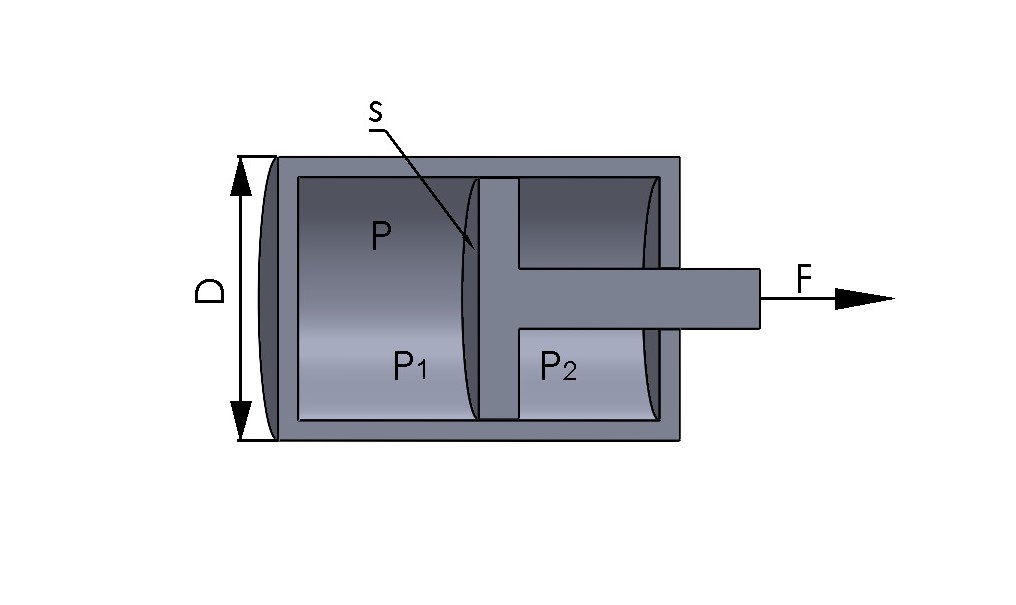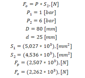 To determine the force in a straight stroke F p and reverse stroke F o of the tightening device it is necessary to calculate the piston area S 1 and the piston rod S2, depending on the pressure in the cylinder chambers P 1 and P 2 and the diameter of the piston D and the piston rod d, shown in Fig.4.
