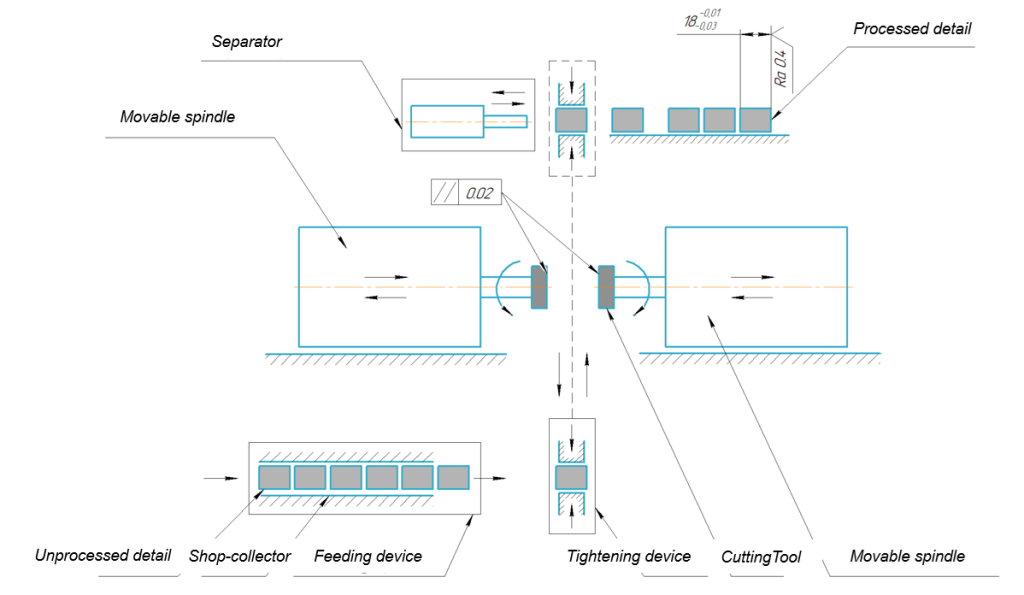 Abstract. The purpose of this work is to design and create an automatic machine for simultaneous processing of two parallel surfaces, which will be implemented as an automatic machine with independent drive of one or both spindles in position and speed. The automatic machine will reduce the cost of time and labor, increase productivity and reduce the cost of production. To achieve the goal, have been developed a conceptual diagram of the necessary automation devices, a kinematic diagram of the designed new specialized devices and a manipulation diagram of the automated technological process. 3D models of the automatic machine with the designed specialized feeding device and specialized tightening device have been created. The necessary calculations have been made, and a work cycle diagram has been compiled.