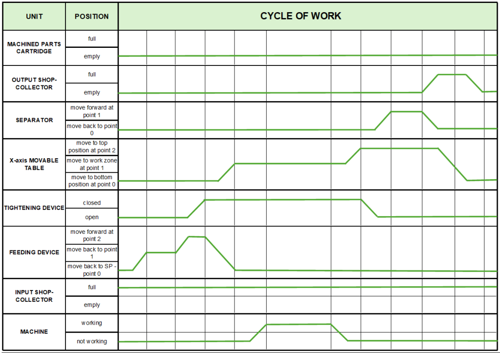 A work cycle diagram of the operation of the designed automatic machine has been drawn up, shown in Fig. 8, which illustrates the times, starting and mutual positions of the structural units relative to each other during one cycle of operation, which is then repeated and is the same until the workpieces in the input shop-collector are exhausted or the output shop-collector is filled with processed parts. In one of the two events, it is necessary to load the shop-collector or replace the machined parts cartridge with an empty one.
