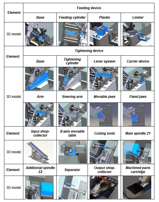 Table 1 shows 3D models of the main structural elements of the designed automatic machine for simultaneous parallel processing of prismatic parts.