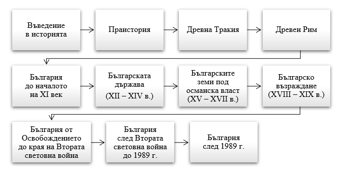 В концептуално отношение учебното съдържание в програмата е разположено на три базисни нива и директно повтаря структурата на учебната програма по история и цивилизации за българските училища в V – VI – VII клас в частта за българската история (фиг. 1 – 2) (Методическо ръководство….https://digitalbag.bg).