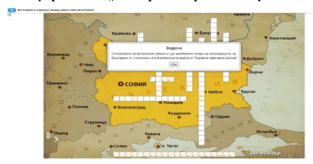 Един от сериозните проблеми на обучението по история е провокиран от прекалената фактологична обремененост на учебното съдържание. В тази връзка, труден за възприемане, разбиране и осмисляне от учениците е хронологичният обхват 1878 – 1944 година от българската история. Фиг. 8, 9, 10, 11 визуализират дигитални упражнения, посветени на периода от Освобождението до края на Втората световна война. Колекцията включва общо 10 упражнения от различен тип, които предлагат възможности за работа с различни източници в хода на учебния процес и тренират не само езиковата и визуалната грамотност, но и уменията за пространствена и хронологична ориентация (https://digitalbag.bg). Интердисциплинарният характер на „живите“ работни листове допълнително подпомага прилагането на кометентностния подход в хода на учебния процес.