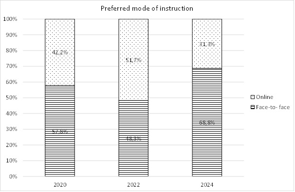 The prevailing preference for face-to-face mode over the other two periods of time is congruent with the established strong inclination for classroom-based learning (Ghosh 2024) for interactional purposes.