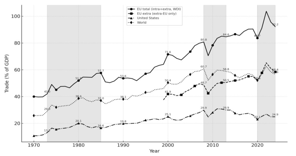 Since the 1970s, the European Union has acted as a structural pillar of globalization. Despite repeated disruptions – the oil shocks of the 1970s, the global financial and eurozone crises of 2008 – 2013, and the pandemic-driven polycrisis of 2020 – 2024 – the EU consistently maintained openness. Trade as a share of GDP followed a long-run upward trajectory, with institutional innovations reinforcing integration after each crisis.