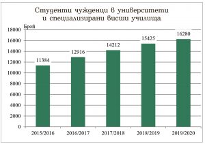 Нарастване на чуждестранните и намаляване на българските студенти отчита Националният статистически институт за учебната 2019/2020 г. В родните университети и специализирани висши училища се обучават 195 хил. български граждани, или с 3700 по-малко от предходната академична година (година преди това намалението е 7600 души). В същото време, чуждестранните студенти нарастват с 5,5% до 16,3 хил., което е с цели 43% повече спрямо учебната 2015/2016 г. Най-голям е делът на студентите от Гърция – 23,7%, следват тези от Обединеното кралство – 16,1%, Германия – 8,8%, Украйна – 6,3%, и Турция – 6%.