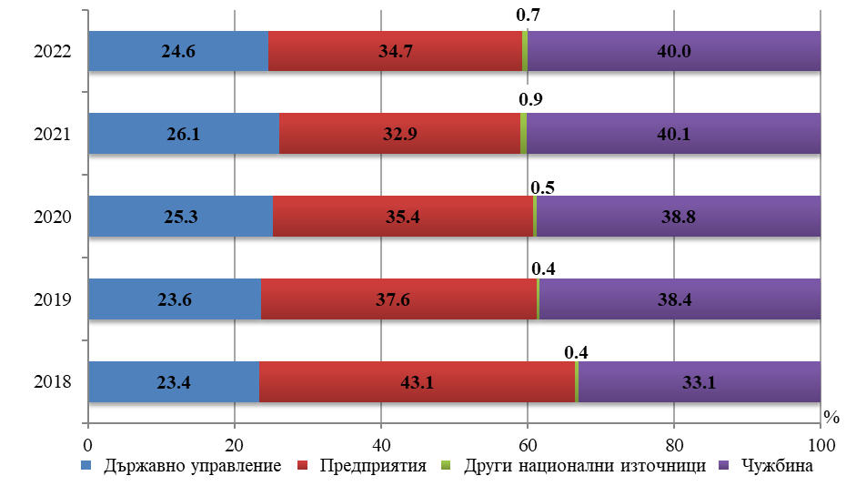 И през 2022 г. най-голям е делът на чуждестранните източници на средства за осъществяване на НИРД – 40% (при 40,1% през 2021 г.). Сектор „Предприятия“ финансира с 34,7% (32,9% година по-рано), държавният бюджет – 24,6% (26,1% през 2021 г.), и други национални източници – 0,7 на сто.