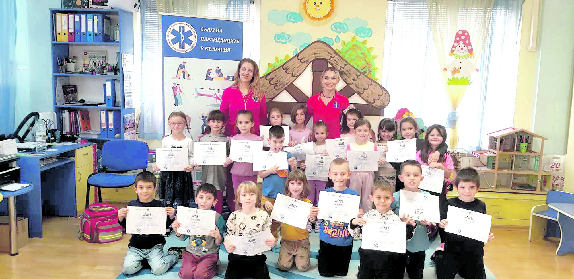 Децата от четвърта група „Слънчице“ с учителки Кети Николова и Светлана Стоянова са първите в града край морето, при които влизат парамедици и не само ги запознават с професията си, но и им показват практики за даване на първа помощ, които децата с лекота усвояват.