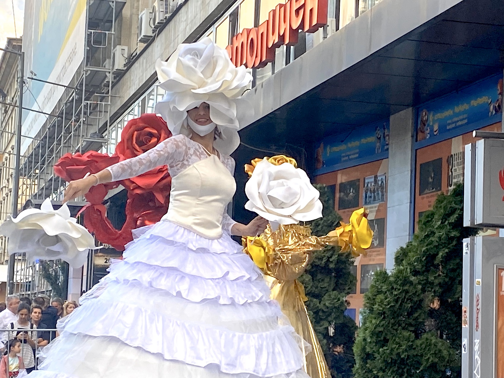Огромни живи цветя – момичета на кокили, облечени в бяло, червено и златно, излизат от Театъра и тръгват бавно пред удивените лица на събралото се множество. Децата са възхитени, а техните родители вече са забравили възрастта си.