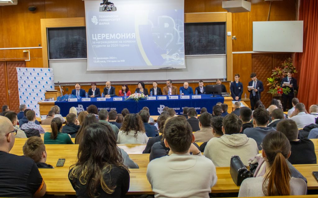 Най-изявените 151 студенти на Техническия университет във Варна за 2024 г. бяха отличени на специална церемония в навечерието на Рождество и Нова година, съобщават от висшето училище. Тя събира най-талантливите младежи от различни специалности и факултети, отличили се с изключителен академичен успех и значими постижения в областта на науката, предприемачеството и спорта.