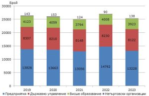 Броят на изследователите в еквивалент на пълна заетост спада с 6,5% до 16 357 души. За сравнение през 2022 г. статистиката отчете, че той е 17 487 души, или със 7,7% повече спрямо 2021 г.