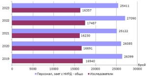Намаление се регистрира през 2023 г. относно персонала, зает с научноизследователска и развойна дейност – той е 25 411 души (в еквивалент на пълна заетост), което е с 6,2% по-малко в сравнение с предходната година. През 2022 г. в НИРД бяха заети 27 090 души, което беше ръст от 7,8% в сравнение с предходната година.