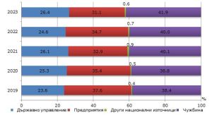 Сектор „Предприятия“ финансира 31,1% от тях (34,7% през 2022 г.), държавният бюджет – 26,4% на сто, или ръст от близо 2 на сто, а от други национални източници се осигуряват 0,6% от финансирането.