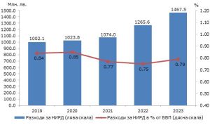 Интензивността на НИРД, измерена като процент на разходите от брутния вътрешен продукт, възлиза на 0,79% и е с 0,04 пункта по-висока в сравнение с 2022 г.