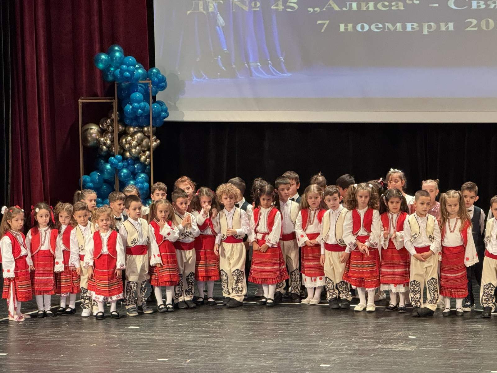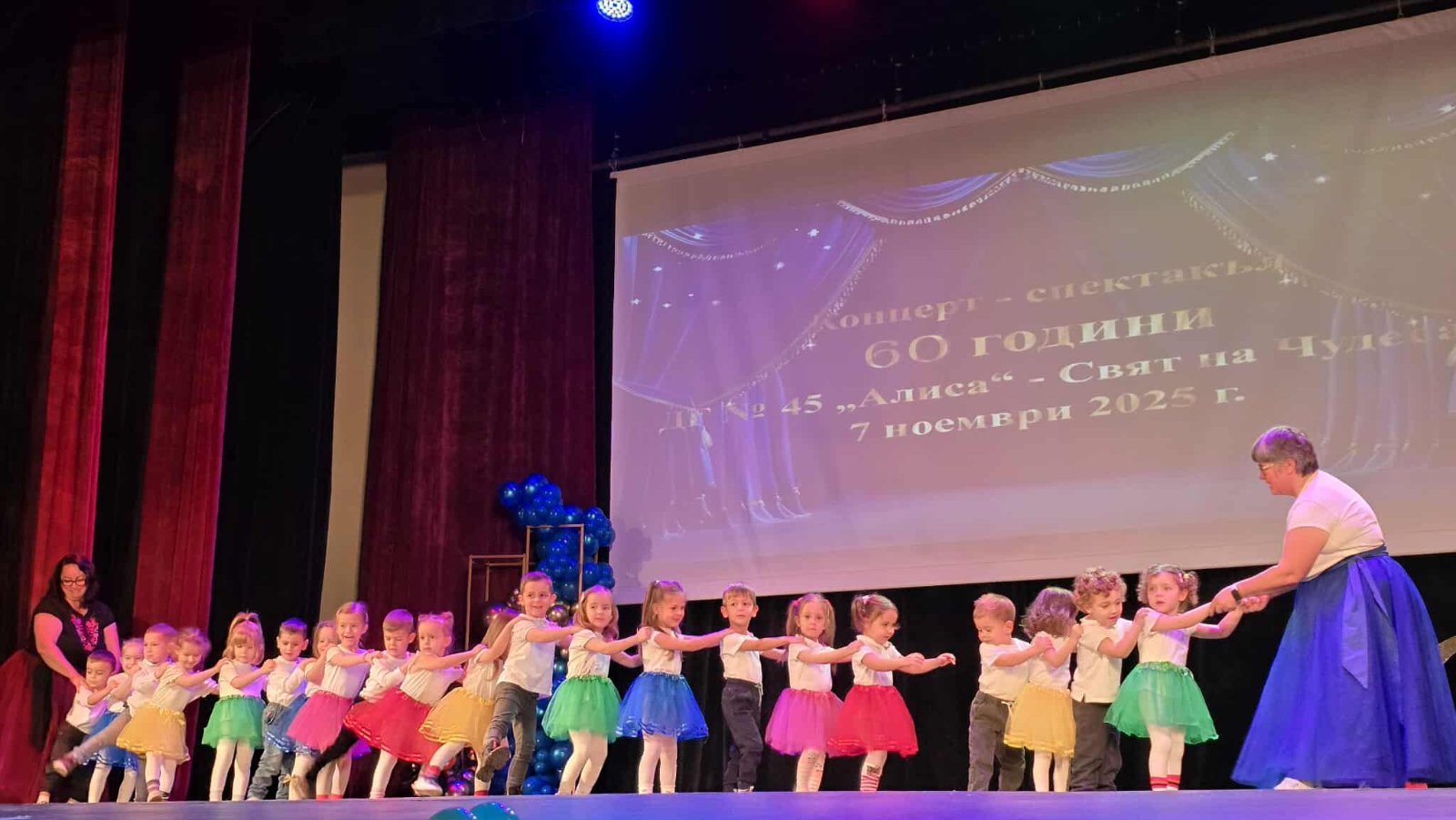 Столичната 45. ДГ „Алиса“ отбеляза своята 60-годишнина с голям концерт на 7 ноември в кино-театър „Освобождение“. На сцената излязоха всички възпитаници на градината. С много артистичност, вълнение, трепети и с красиви сценични костюми малчуганите представиха пред публиката невероятни песни и танцови хореографии, създадени от техните учители.