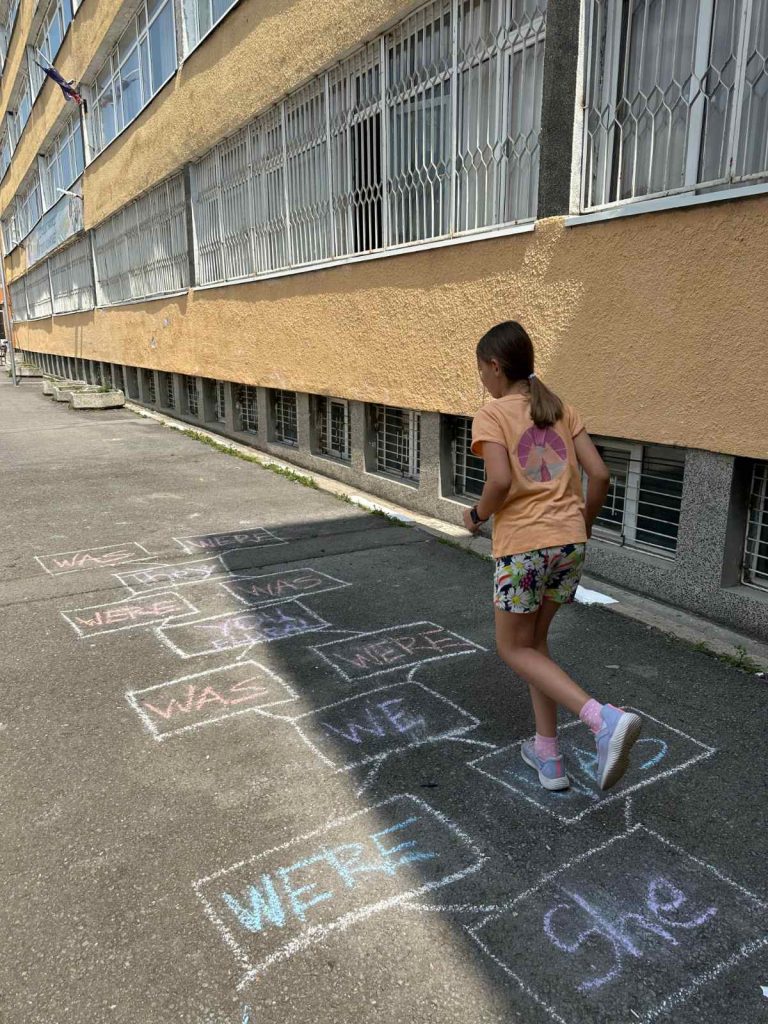 В края на учебната година упражняват по забавен начин и миналото време с игра на дама. Квадратчетата, върху които трябва да се стъпва на два крака, са с лични местоимения. А двойните след тях са с „was“ или „were“, като всяко дете трябва да свърже съответното лично местоимение и да скочи в правилното квадратче.
