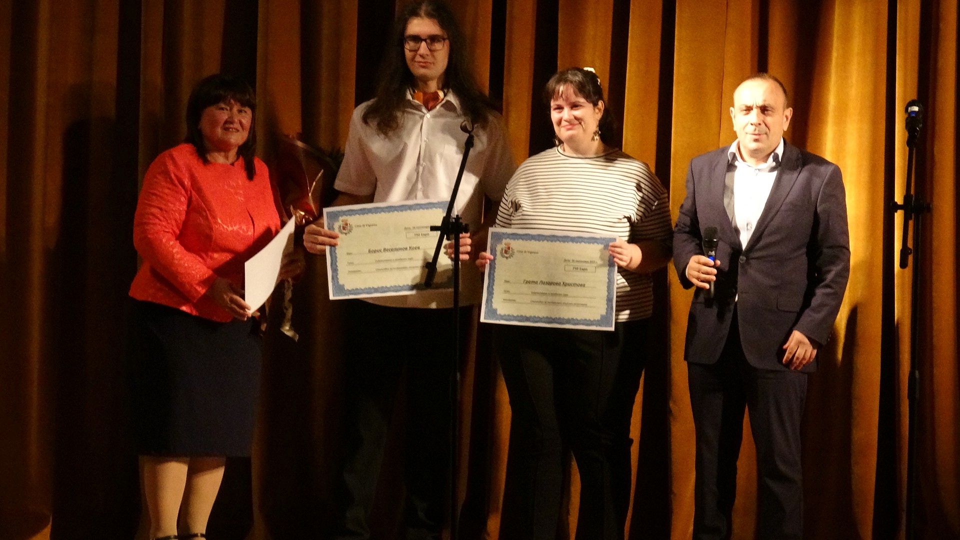 на дванадесетокласниците Грета Христова и Борис Коев. Те получиха по 750 евро за постигнати отлични резултати в училище и участия през годините в извънкласни и обществени дейности.