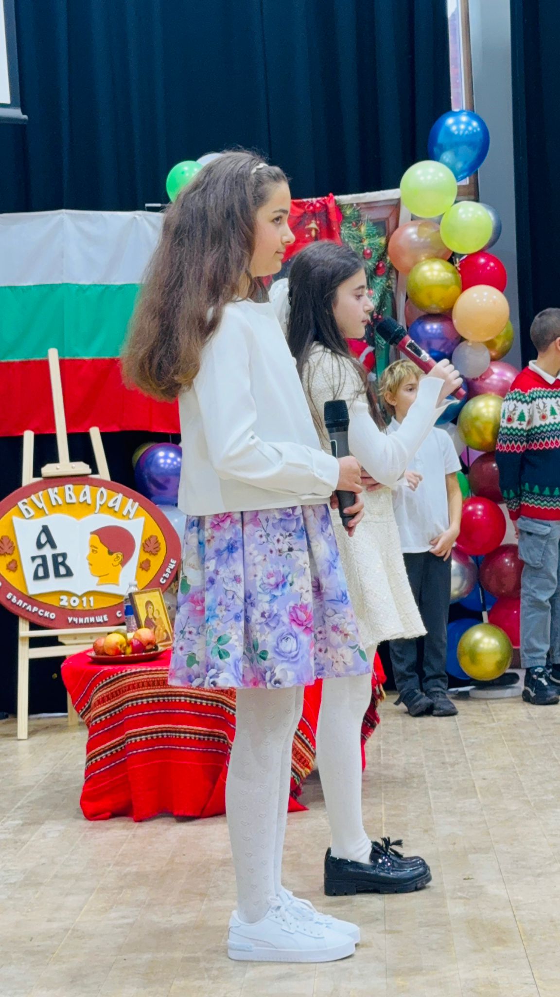 Празничните инициативи започват с подготовката на сценария за коледния концерт „Между два свята“ и благотворителния базар „Нашите деца – мост между два свята“. Както всяка година, чрез базара събират дарения, с които правят празниците в училището още по-весели и цветни, както и за закупуване на традиционни български народни носии.