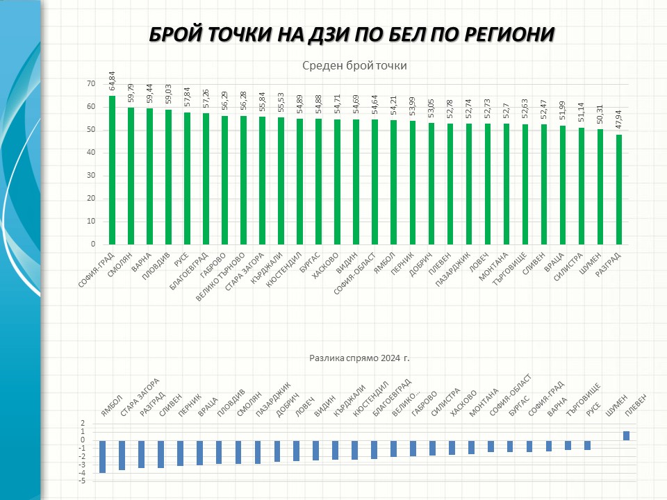 Традиционно най-добри резултати са постигнали зрелостниците от София-град, Смолян, Варна, Пловдив и Русе, а най-ниски – от Разград, Шумен, Силистра, Враца и Сливен.