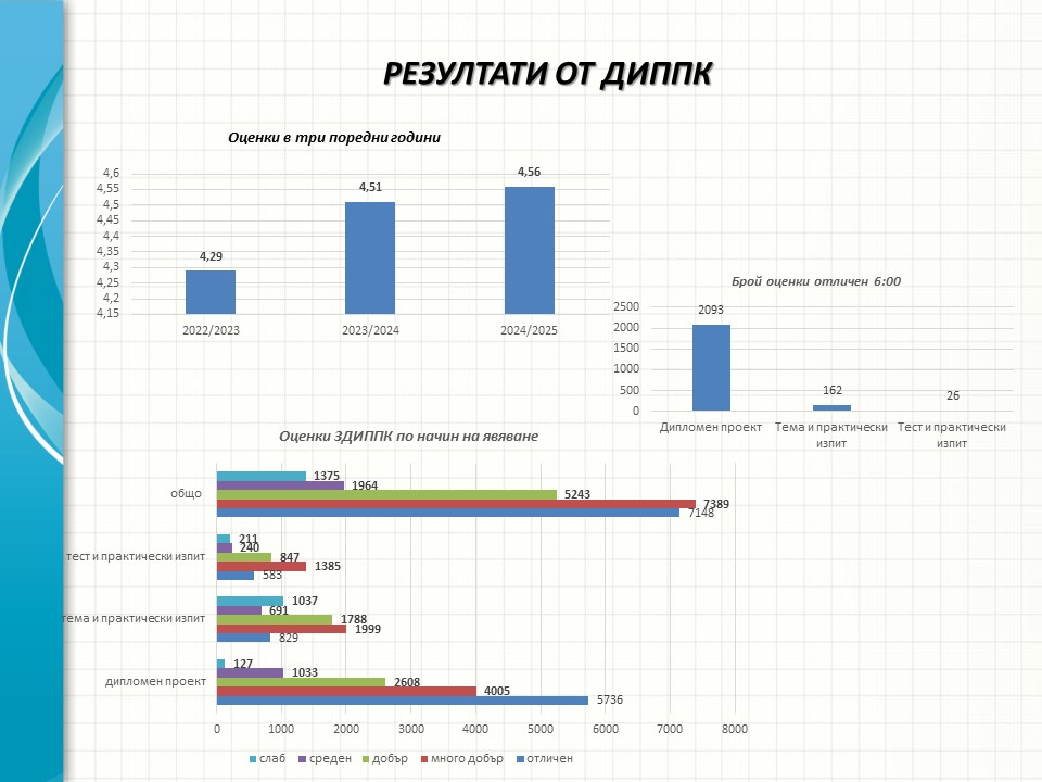 Продължава тенденцията за повишаване средния успех на държавния изпит по професионална квалификация. Тази учебна година гимназистите са постигнали оценка „Много добър 4.56“, което е с пет стотни повече от предходната и с 27 стотни увеличение спрямо 2022/2023 г.