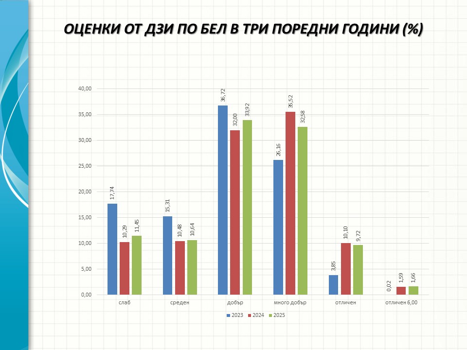 Средният резултат на държавния зрелостен изпит по български език и литература (БЕЛ) е 57,53 точки, или „Добър 4,27“. Резултатът е с 0,95 по-нисък от миналата година, когато випуск 2024 получи 58,48 точки („Добър 4,32“).