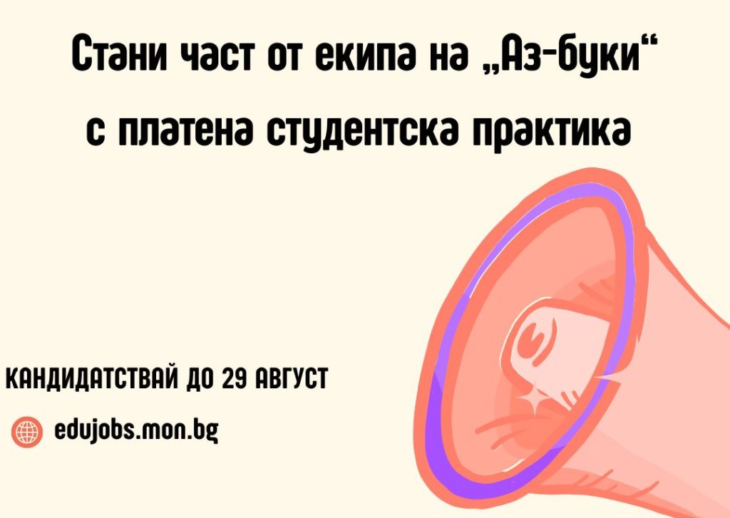 Националното издателство за образование и наука „Аз-буки“ отваря врати за млади таланти с интерес към журналистиката, комуникациите, издателската дейност и новите медии. В рамките на проекта с европейско финансиране „От висше образование към заетост“ за студентски практики на Министерството за образованието и науката (МОН) Издателството обявява свободни позиции за амбициозни студенти, които искат да приложат на практика наученото в университетските аудитории.