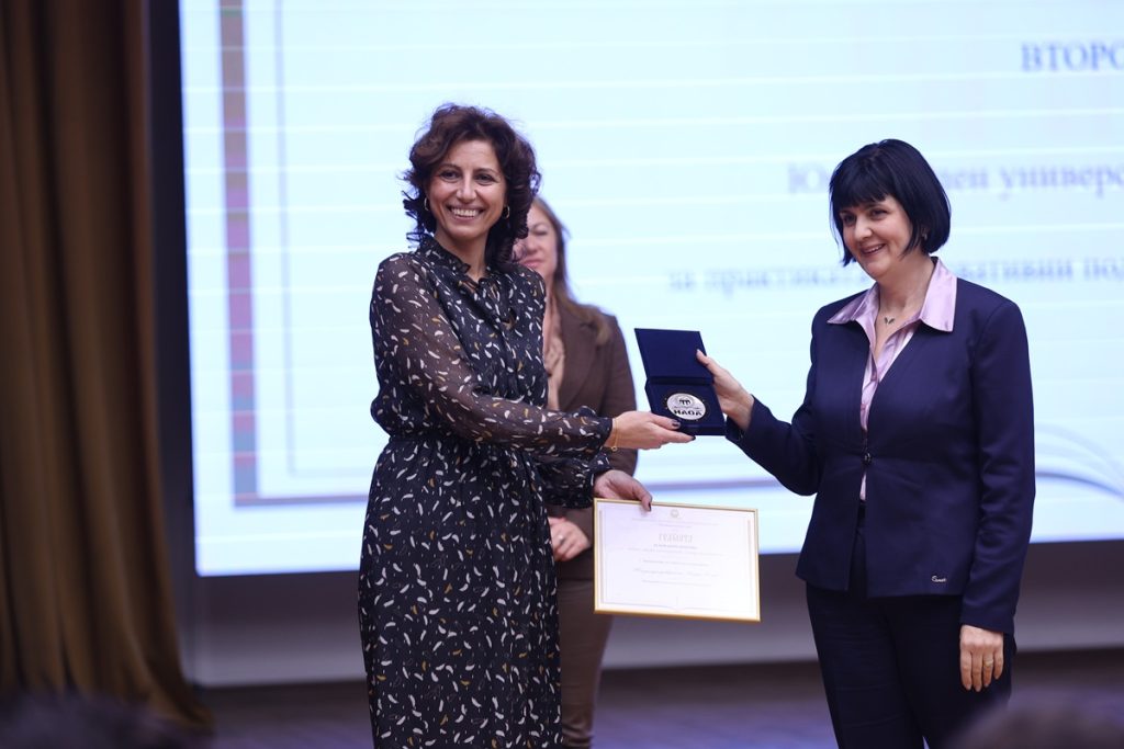 В категория „Практика за ангажиране на студенти и млади учени“ бе отличен Югозападният университет за инициативата „Форум „Българска граматика“ и състезанието „Езикови майстори“. Наградата връчи доц. Николета Кузманова, заместник-председател на Народното събрание. Второ и трето място спечелиха практиката на УНСС – „Есенна академия“, и на Техническия университет в София – „Делова игра „Стажанти човешки ресурси“.
