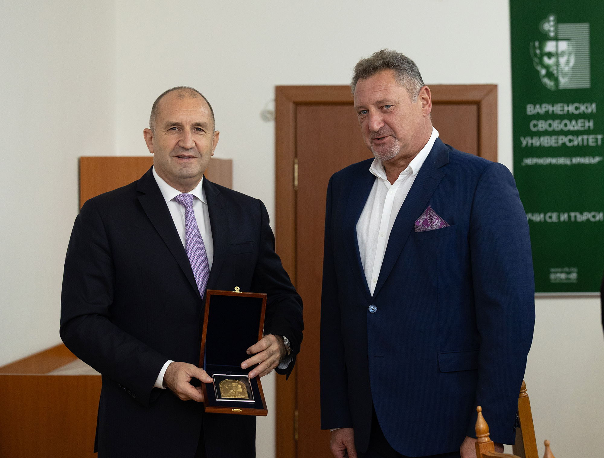 Академичното ръководство връчи на президента Радев златен плакет на Варненския свободен университет.
