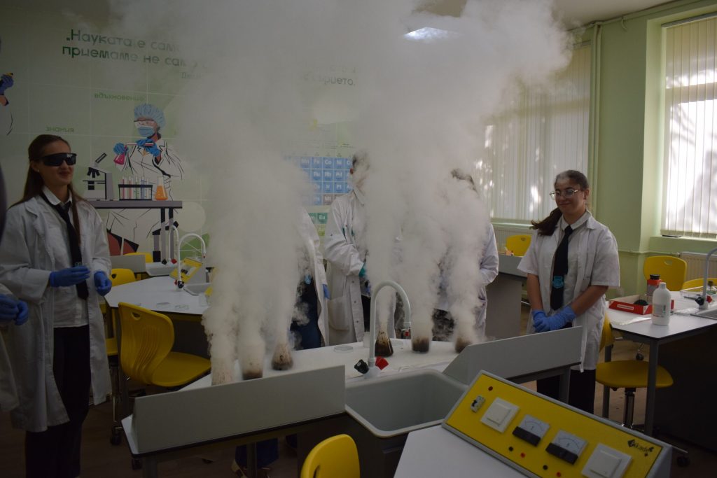 Тя наблюдава и опити, които учениците правиха в новите кабинети.