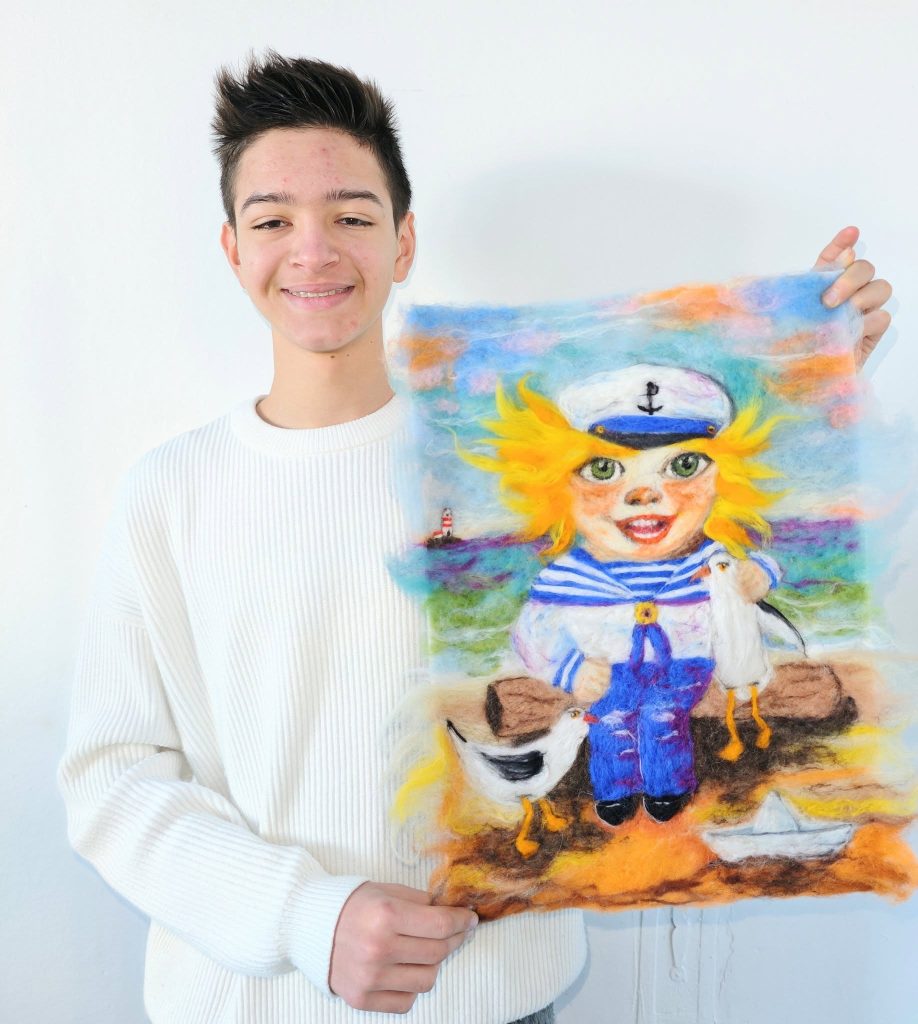 Никола Кацарски (IX клас, НУИ „Панайот Пипков“, Плевен) – първо място в раздел „Проза“ и второ място в раздел „Приложно изкуство“ за творба, създадена чрез сухо плъстене на вълна Снимка Фондация „Шанс за децата и природата на България“