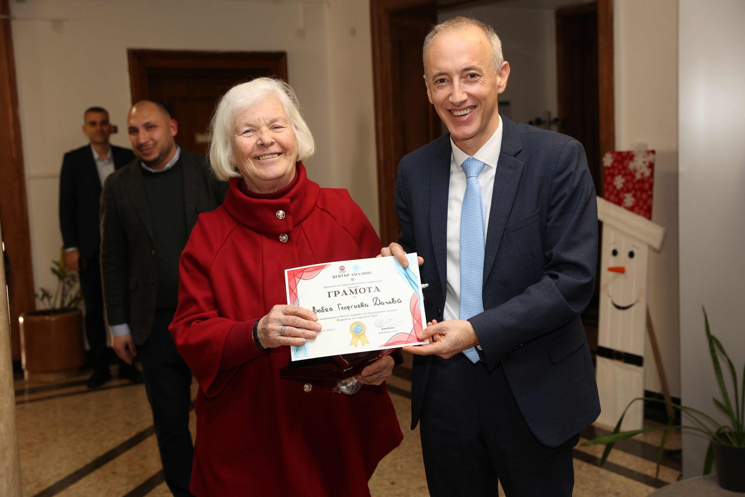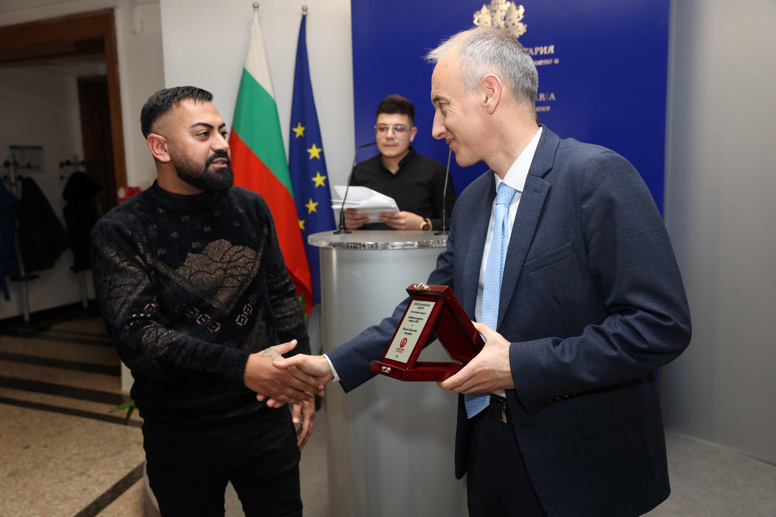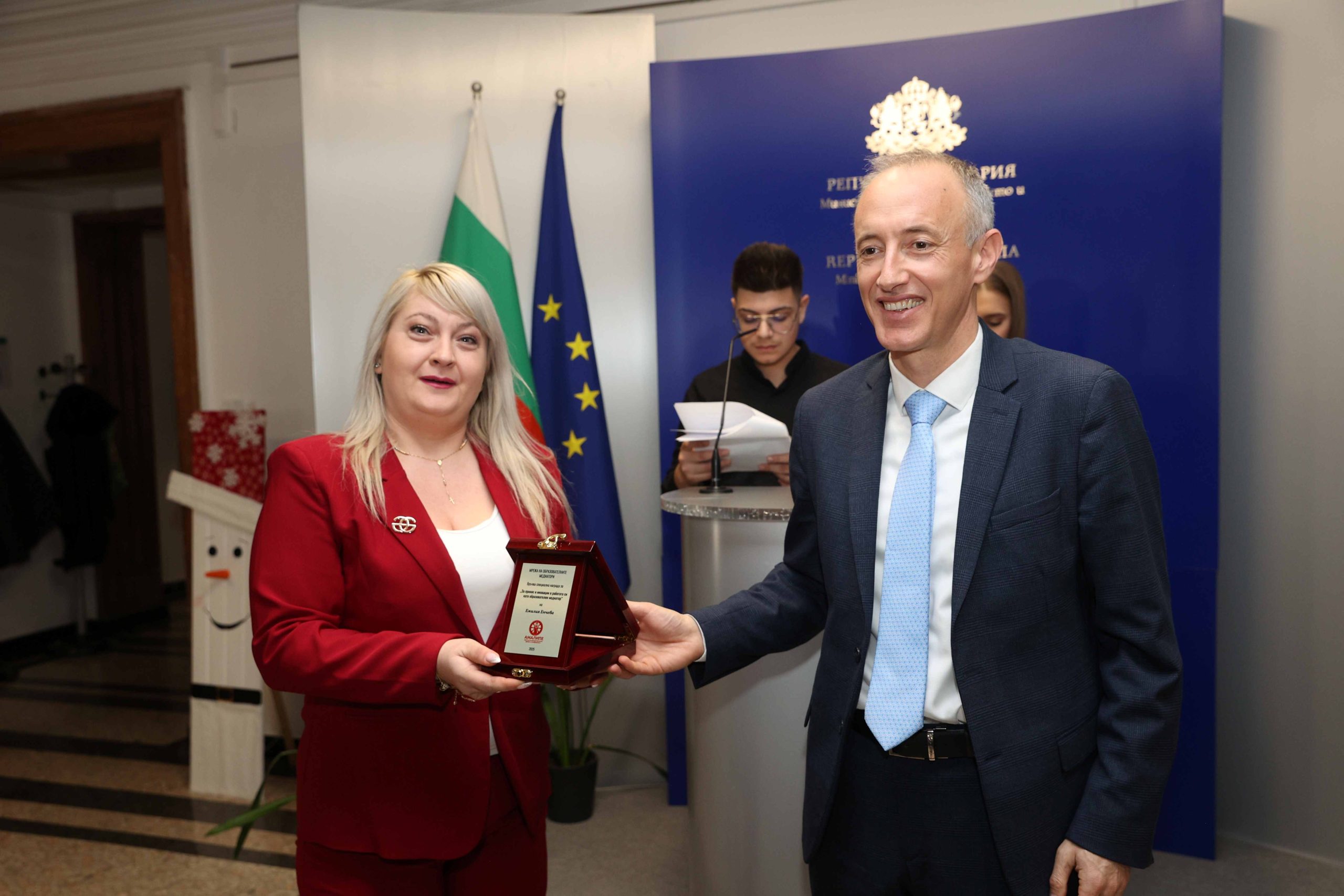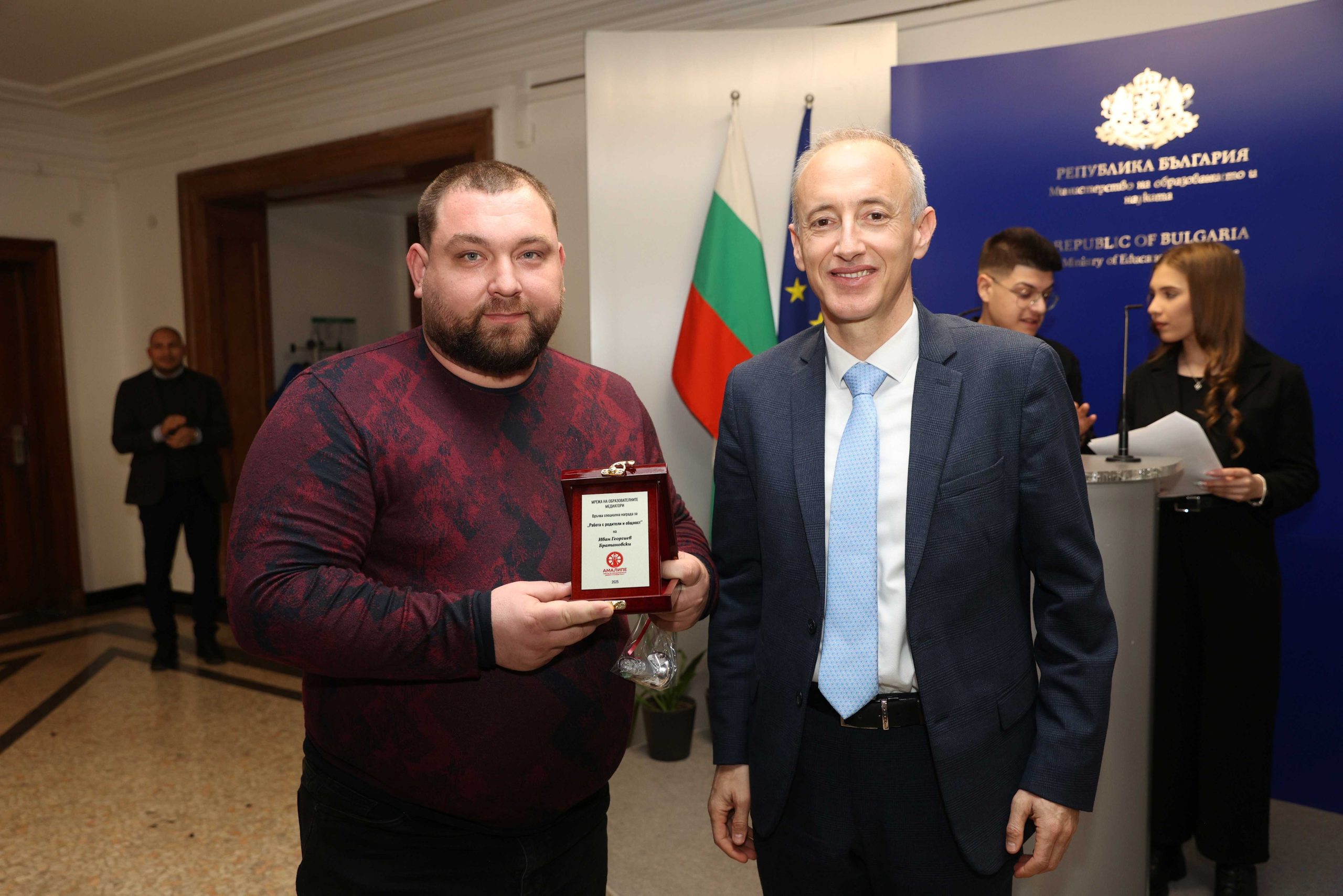 Министър Красимир Вълчев пък получи отличието „Добротворец на 2025 г.“. Наградата му бе връчена от директора на СУ „Трайко Симеонов“ в Шумен – Галина Сакарова.