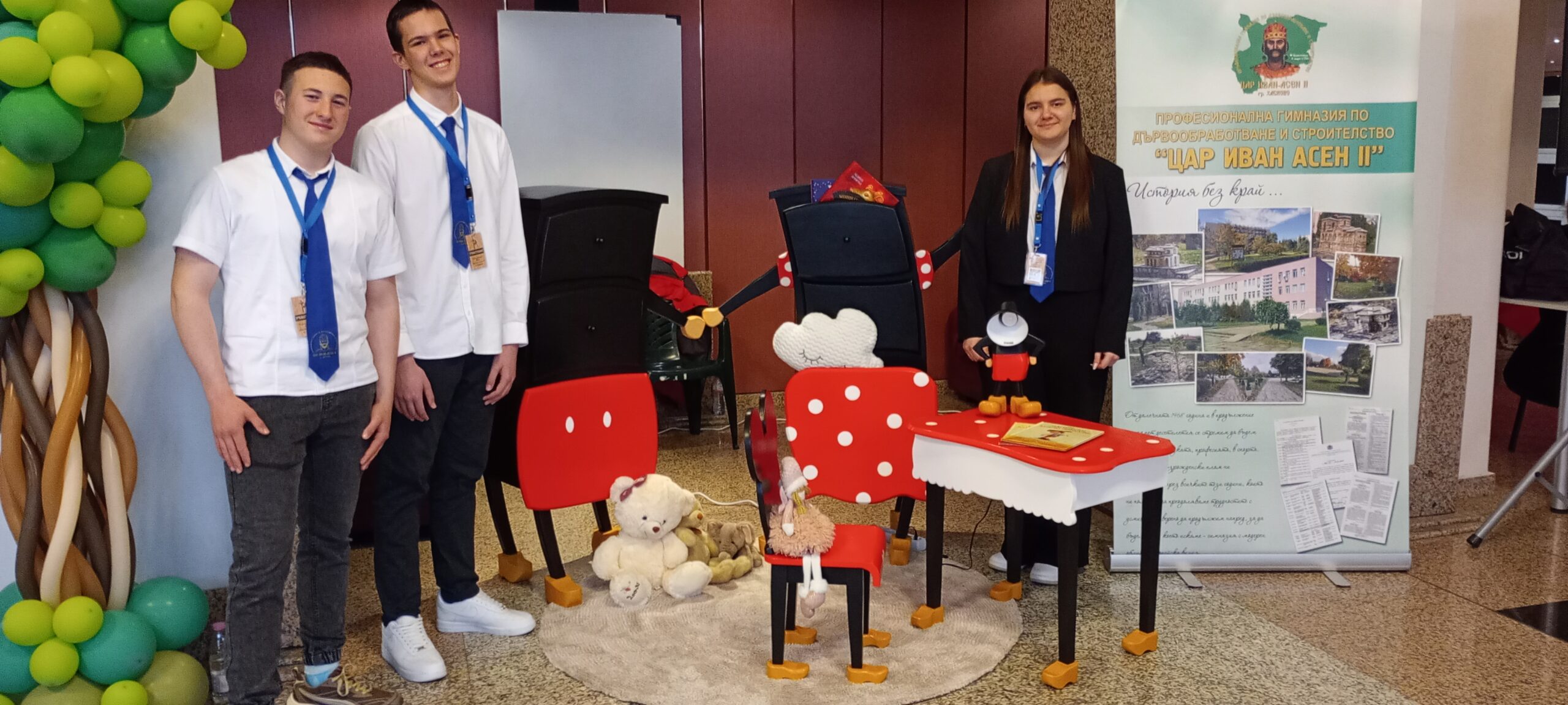 В категория „Мебели“ първото място печели отборът на Националната професионална гимназия по горско стопанство и дървообработване „Сава Младенов“ в Тетевен, който представя комбиниране мебел за малки пространства, включваща скрин с място за книги и подвижен плот, който го превръща в бюро.