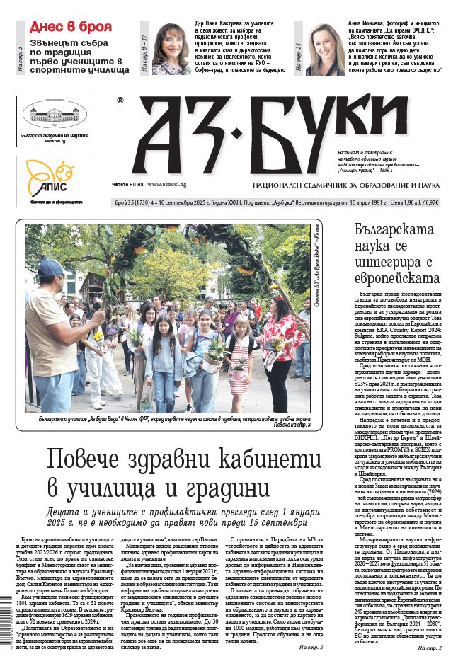 <h4><img class="size-medium wp-image-163969 alignleft" src="https://azbuki.bg/wp-content/uploads/2025/09/azbuki-2025-35-212x300.jpg" alt="" width="212" height="300" />В новия брой четете:</h4> - Повече здравни кабинети в училища и градини - Осем медала от Международната олимпиада по английски - Първият звънец удари в спортните училища - Когато математиката създава приятелства: За талантливата ученичка от Пловдив Димана Праматарова важни са не само медалите от състезанията, а и емоциите, удовлетворението и познанствата за цял живот - Д-р Ваня Кастрева, дългогодишен началник на РУО – София-град: Образованието е част от живота ми и тази страница няма как да бъде затворена - Училище за… лешояди: Международен проект помага за намаляване на нелегалното унищожаване на хищните птици - Екоприключение в края на лятото - Само „различните“ могат да променят света: Диагнозата не е пречка за обектива, казва фотографът и инициатор на кампанията „Да играем ЗАЕДНО“ Анна Йончева [flipbook pdf="https://azbuki.bg/wp-content/uploads/2025/09/v.-az-buki-br.-35-2025-g.pdf"] <a href="https://azbuki.bg/wp-content/uploads/2025/09/v.-az-buki-br.-35-2025-g.pdf">Изтеглете</a> броя на вашeто устройство.