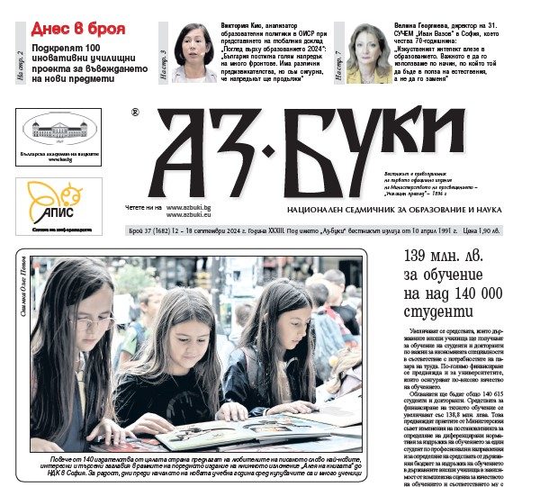 <h4><img class="size-medium wp-image-133115 alignleft" src="https://azbuki.bg/wp-content/uploads/2024/09/azbuki-37-24-212x300.jpg" alt="" width="212" height="300" />В новия брой четете:</h4> - Интервю на проф. Галин Цоков, служебен министър на образованието и науката: Не може да има промени с демотивирани учители и ученици / Можем да отворим през следващите седмици за предварително обсъждане с педагогическата общност визията за структурата на нови учебни програми - МОН иска повече средства за образование в бюджет 2025 - 139 млн. лв. за обучение на над 140 000 студенти - Подкрепят 100 иновативни проекта: Училищата могат да получат до 18 000 лв. за въвеждането на нови предмети и прилагане на интердисциплинарно учене - Нараства делът на младите учители: Отделяме повече средства за образование, сочи проучване на Организацията за икономическо сътрудничество и развитие - Югозападният приема база за STEM умения: С изграждането на лаборатории и лекционна зала в университетския център „Бачиново“ ще се подпомага един от трите регионални центъра - Просветен завет на 400 години: В ОУ „Петър Парчевич“ в Чипровци честват знакова годишнина от създаването на първата светска образователна институция у нас „Бастилията“ празнува - 31. СУЧЕМ „Иван Вазов“ в София ще отбележи своята 70-а годишнина с алманах, голям концерт и редица инициативи през цялата учебна година <a class="fp-embed" style="max-width: 100%;" href="https://73fc06f9.flowpaper.com/372024/" data-fp-width="400px" data-fp-height="300px">в. Аз-буки, бр. 37, 2024 г.</a><script async defer src="https://cdn-online.flowpaper.com/zine/3.8.3/js/embed.min.js"></script> <a href="https://azbuki.bg/wp-content/uploads/2024/newspaper/%D0%B2.%20%D0%90%D0%B7-%D0%B1%D1%83%D0%BA%D0%B8%2C%20%D0%B1%D1%80.%2037%2C%202024%20%D0%B3..pdf">Изтеглете </a>броя на вашeто устройство.