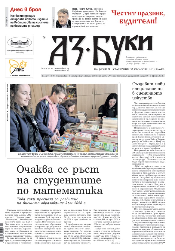 <h4><a href="https://azbuki.bg/wp-content/uploads/2024/10/screenshot-2024-10-31-100005.jpg"><img class="size-medium wp-image-136377 alignleft" src="https://azbuki.bg/wp-content/uploads/2024/10/screenshot-2024-10-31-100005-209x300.jpg" alt="" width="209" height="300" /></a>Четете в новия брой:</h4> - Очаква се ръст на студентите по математика - Издателство „Аз-буки“ се включва в Университетската седмица на книгата - Повече млади учители в клас: 134 новоназначени столични преподаватели получиха символичния ключ на познанието - По-образованите – по-добре платени: Средният облагаем доход на висшист е 2523 лв., а втората диплома дава с 300 лв. отгоре - Гимназисти разработват софтуер за оценяване на общинска администрация - Проф. Георги Вълчев, ректор на Софийския университет „Св. Климент Охридски“: Денят на будителите е време за размисъл - От шиене на копче до дигитални познания: ОУ „Иван Вазов“ в село Извор предлага различна група за занимания по интереси за всеки ден от седмицата - С подкрепа за всяко дете В ОУ „Васил Априлов“ в Исперих залагат на индивидуалния подход - Големите малки приятели на Врачеш: Детската градина в ботевградското село расте и става все по-желана - Маша Илиева, примабалерина: Животът ме научи на смирение <a class="fp-embed" style="max-width: 100%;" href="https://73fc06f9.flowpaper.com/442024/" data-fp-width="400px" data-fp-height="300px">вестник Аз-буки 44/2024</a><script async defer src="https://cdn-online.flowpaper.com/zine/3.8.3/js/embed.min.js"></script> <a href="https://azbuki.bg/wp-content/uploads/2024/newspaper/%D0%B2.%20%D0%90%D0%B7-%D0%B1%D1%83%D0%BA%D0%B8%2C%20%D0%B1%D1%80.%2044%2C%202024%20%D0%B3..pdf" target="_blank" rel="noopener">Изтеглете</a> броя на вашeто устройство.